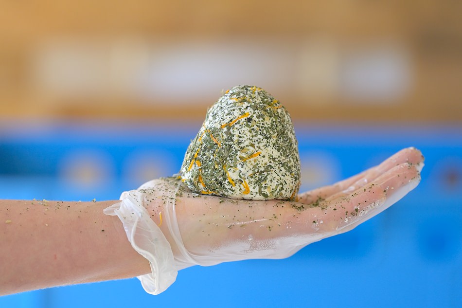 Und so appetitlich sieht der «Formaggino Val Colla» aus… naturnahe Tierhaltung, Alpenkräuter bereits in der Milch, Bio-Bergkräuter beigemischt und sorgfältige Verarbeitung… als Vorspeise und kleine Zwischenmahlzeit… so fein kann Alpsommer schmecken.
