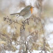 Eisfreies Flachwasser gibt es nur noch entlang von Bächen und Flüssen… dieses Rotkehlchen hat eine Trinkmöglichkeit am Ufersaum gefunden.