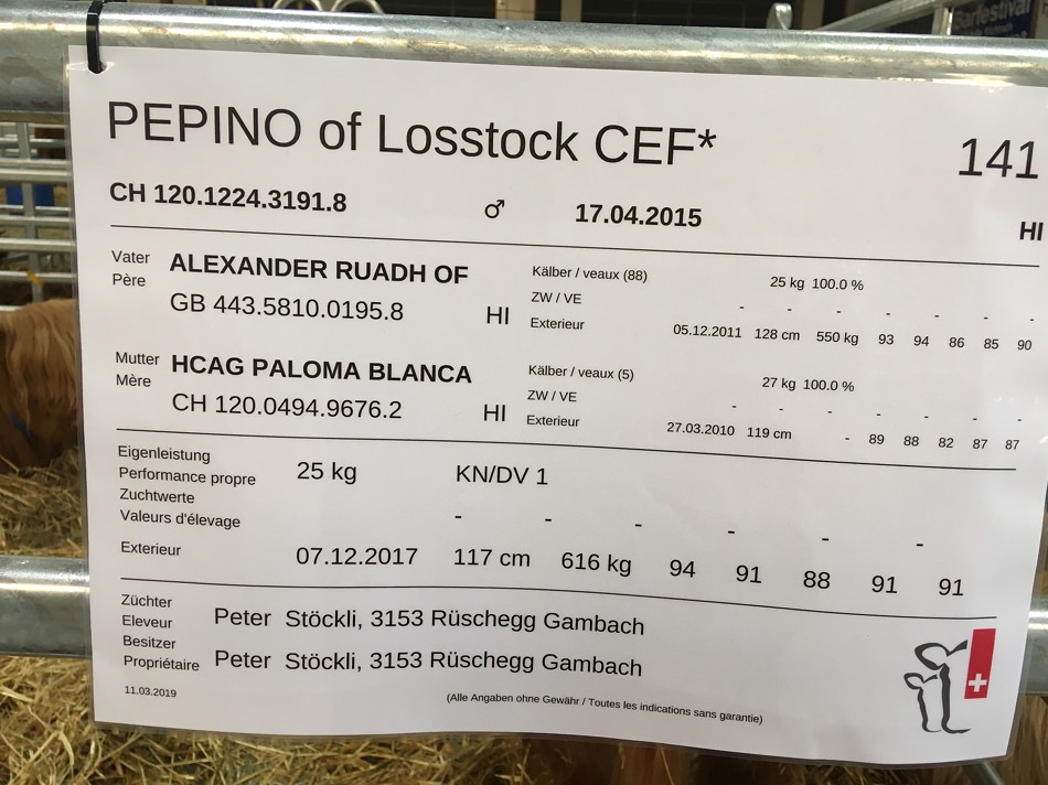 Die «Identitätskarte» des Tieres ist aufschlussreich. PEPINO wurde am 17. April 2015 geboren und sein Vater Alexander war ein importierter Stier aus Schottland. Bereits im vergangenen Dezember wog er 616 kg… und allein schon sein Name verspricht ja einiges. PEPINO ist im italienischen ein herzlicher und liebevoller Name… erinnert aber auch an Temperament und Pfeffer… und das kann ja bei einem Zuchtstier auch nicht schaden…