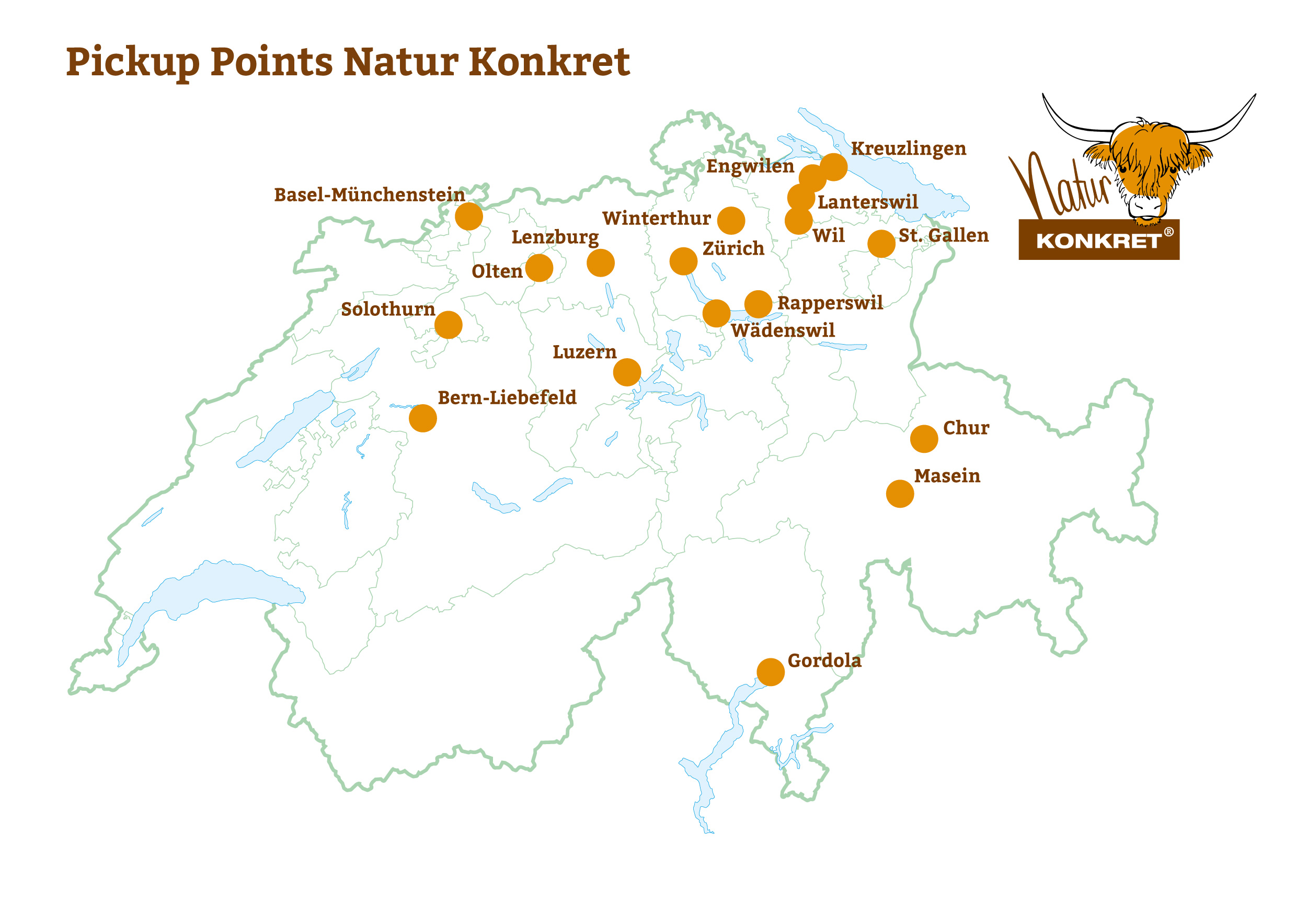 Weiterhin bieten wir einen kostenlosen Abholservice an 20 Pickup Points in der ganzen Schweiz an.