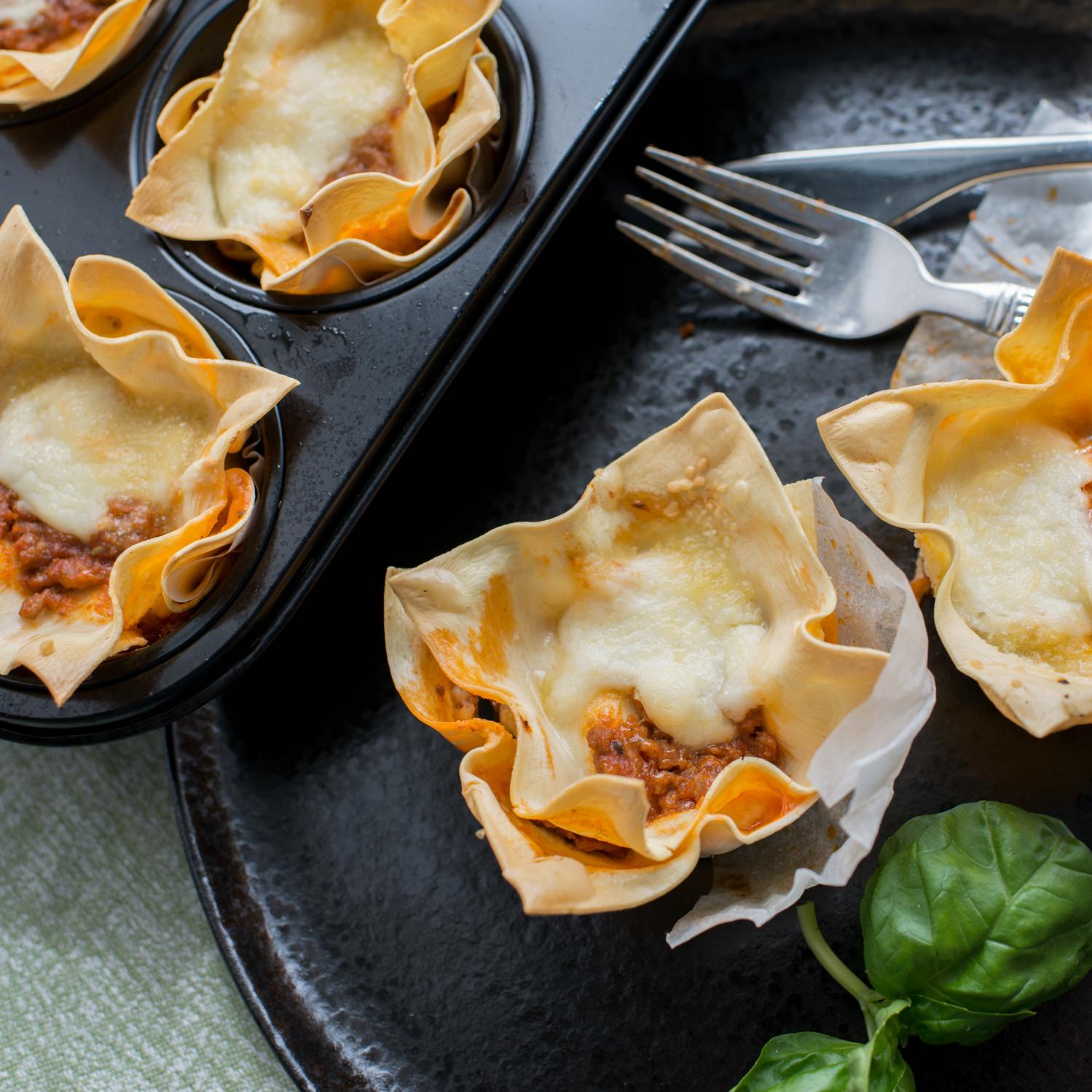 Die Formen im Muffinblech mit Backpapier auslegen. Jeweils ein Lasagneblatt einlegen und leicht in Form bringen, so dass der Teig die Form vom Muffinblech annimmt. Anschliessend 2/3 der Hackfleischsauce in den Formen verteilen. Etwas Béchamel und geriebene Käse darüber geben. mit einen neuen Teigblatt zudecken und leicht andrücken. Den Rest Hackfleisch sowie die übrige Béchamel Sauce obendrauf verteilen. Mit etwas geriebenem Käse dekorieren und im vorgewärmten Ofen bei 200°C backen. Warm servieren.